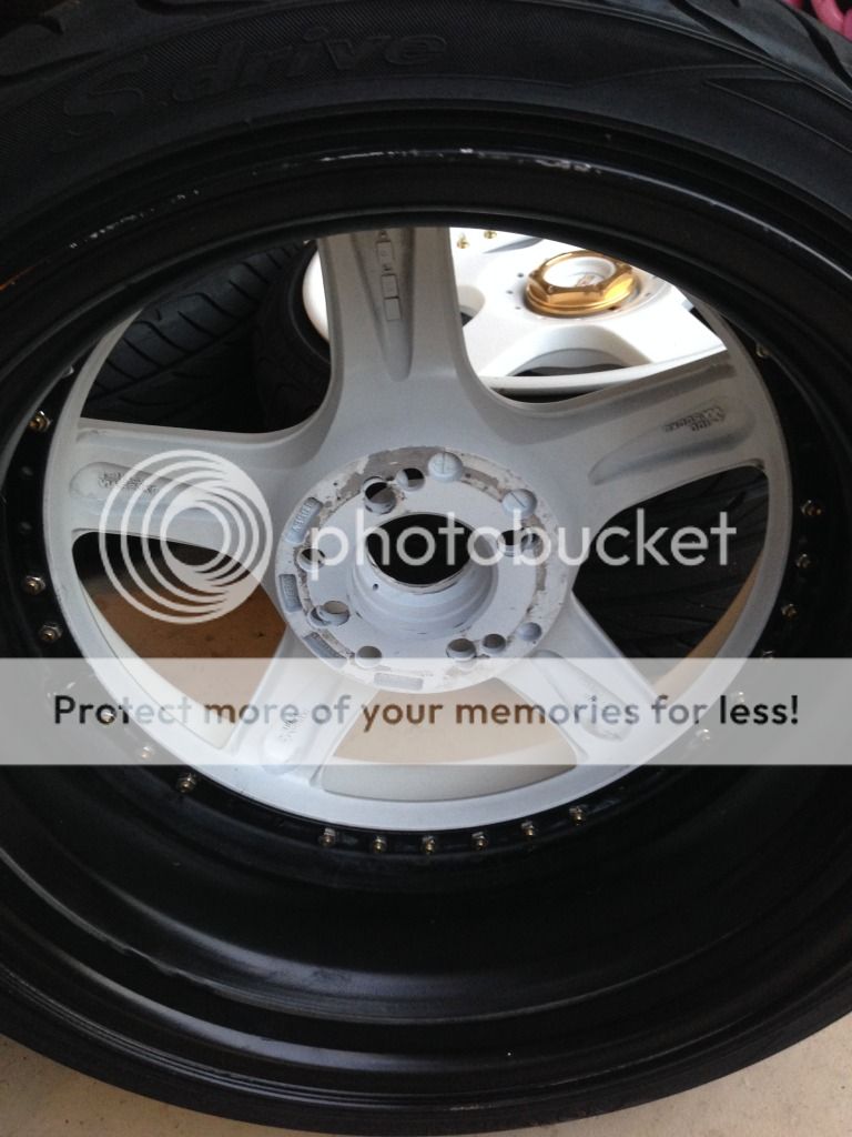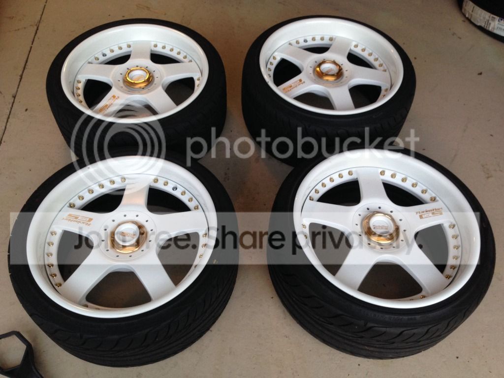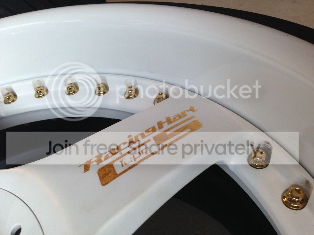 Newly restored Racing hart c5 wheels with Yokohama s drive tires , wheels are restored and used for one car show . They are BIG 17x10.5 (7" back spacing)and 17x9.5 (5.5" back spacing) , the wheels where drilled from 5x114.3 to 4x100 ( could be changed back if you wanted to ) these where striped bare and painted satin white in the center and the brand new 3" lips are painted gloss white , custom gold leaf logo on spoke and center caps the center nuts are real gold plated , the tires were new and have about 200 miles on them they are 225/35/17 I have over 4500$ in these wheels my loss is your gain , love these wheels and spent over a year putting them together. Project took a different route and though I hate too i decided to sell them to make room