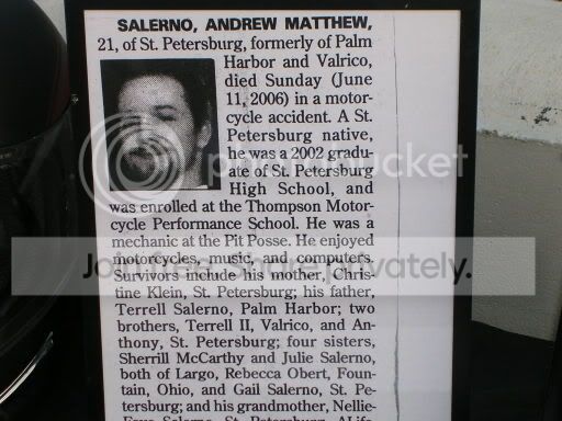 Pics of the ride...most of it was a slow speed motorcade through the neighborhoods with a few cars following behind; we rode by his grandmothers where he lived, rode by his family's house and everyone revved their engines to the limit as they were standing outside, (put shivers through my spine) rode by his best friends house that he left the morning of the accident, and finally went to the highway...it took more than two hours...