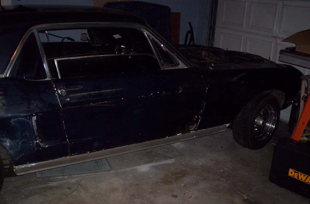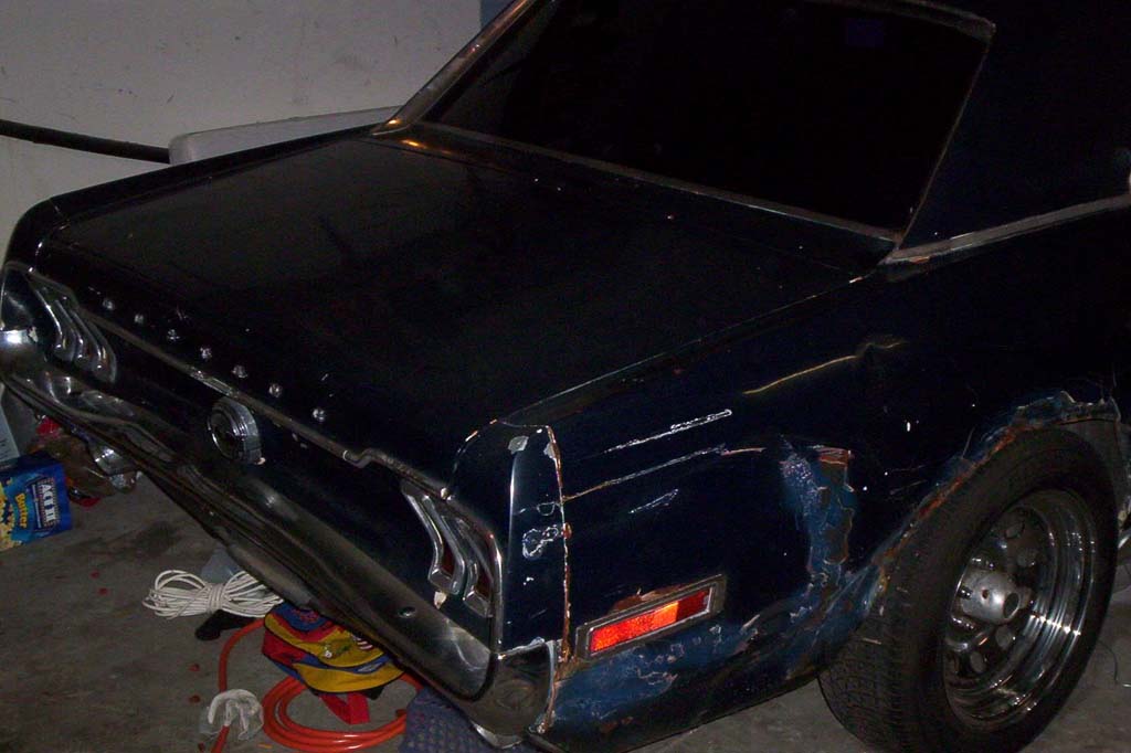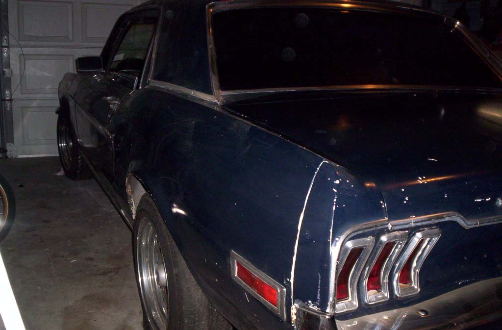 The car is a '68 coupe, it's a original v-8 coupe and it's an "A" code car which means it came with the 4valve, 4barrel, v-8, not the 2valve, 2barrel. It was originally yellow with deluxe interior. It is now blue and the seats are aftermarket and the dash would need to be replaced. The door panels are original,black and in savable condition. it is a car worth restoring simply because it's an "A" code v-8 orginal coupe. The body needs a passenger rear quarter and a passenger door skin, these got wrinkled when the car hit a wall while rolling. The impact was minimal but it did ruin the quarter skin. The replacement skin sells for $129.99 in mustang parts unlimited. The impact did not damage the floor pans or frame. The floor pans are original and are rust free. There isn't any visable rust under the car or in the body. The trunk is undamaged and rust free, and it has the original door tag as well.The motor has a weiland intake a holley Dp carb. long tube headers and some sort of aftermarket heads. The trans is a c-4 and it has a hurst shifter in the car. Also, it has south side control arms in the back.