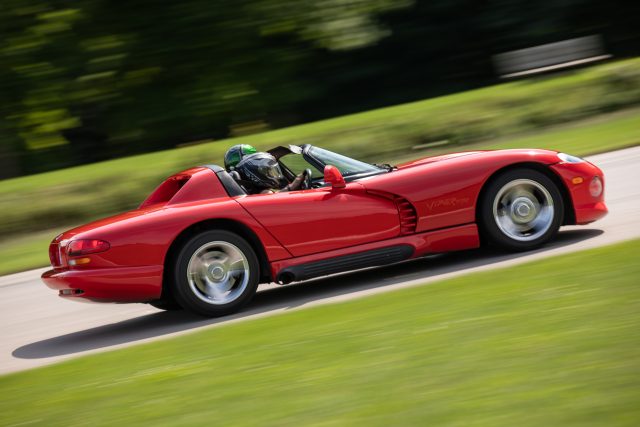 There’s no chance of testing my helmet’s rollover resistance, of course; not in this sweetheart of a roadster. I don’t expect it to be fast, because it isn’t, at least not by modern standards. Contemporaneous testers struggled to get the early Vipers down to the 13-second mark through a quarter-mile; today, a dealer will happily sell you a 5300-pound Jeep Grand Cherokee Trackhawk that can more or less count one Mississippi, two Mississippi before running the big snake down at the 1320 line.