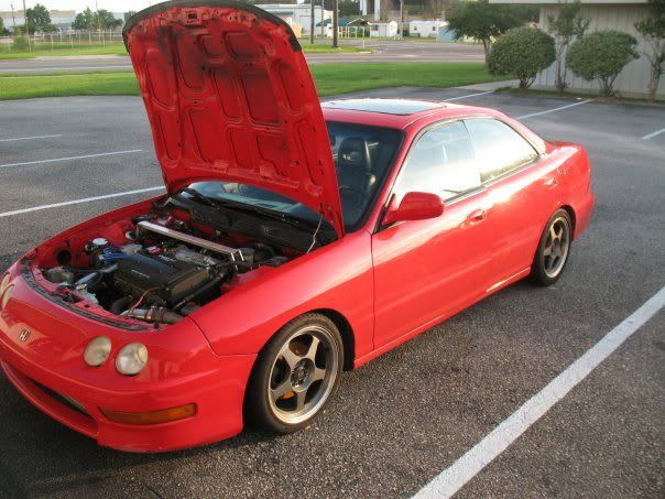 I just moved here from pensacola didnt know this site existed and this was my first suprise moving here thanks for the welcoming. here is a REAL discription It is red it is a 98 four dour integra black interior no tint flowmaster exhaust 3" t3 60-2 turbo love fab manifold rc injectors 780 walboro 255 fuel pump cp pistons benson sleeved block eagle rods s300 hondata ssq BOV greddy turbo timer and boost controler detachable steering wheel no tint the right front part of the bumper sticks out a little it is lowered kyb str. tein springs blank brembo rotors sun roof chiped back right tail light small dent in trunk. paint is cracking above driver and front passenger window black leather seats gray in the back and black carpet. Thanks for the help your real cool dude.
