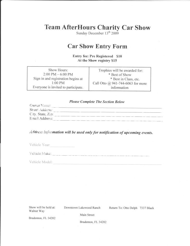 Team AfterHours would like you to join us at Lakewood Ranch Main St. for our holiday show. This event will be held December 13th, 2009 from 1pm-6pm. The show will be another charity event so please bring your cars, family, and friends for another great get together. All makes and models welcome!! There will be music, food, trophies, and lots of cars. Please contact us for pre-registration, questions, or if you are interested in a vendor spot.