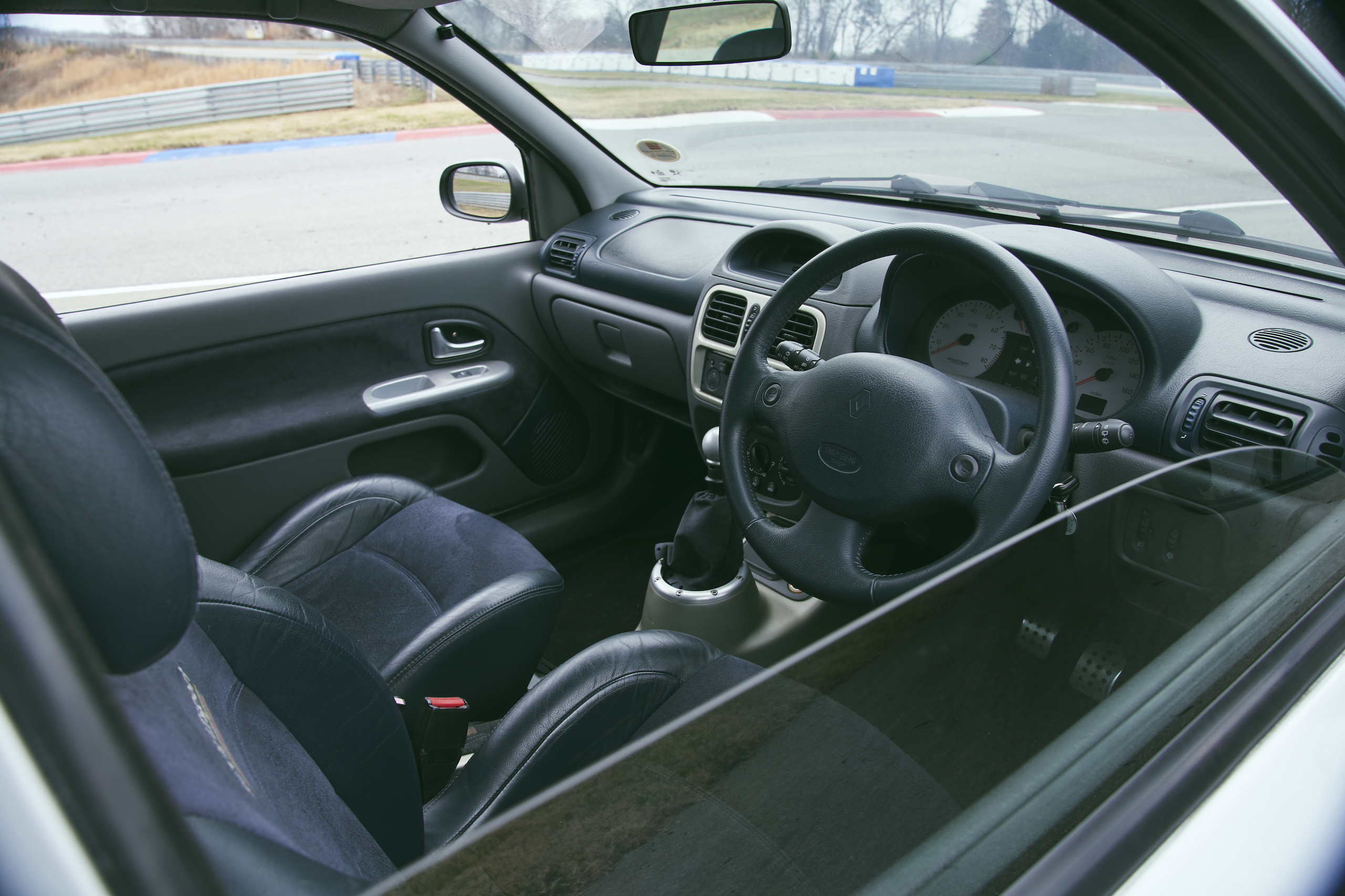 Andrew TrahanFor two cars built on the same idea, by the same company, the Clio and the R5 are remarkably different. In the R5, the engine’s light vibration is felt mostly in your spine. The Clio’s V-6 is smoother but more present, coursing through more of the car. The more softly suspended Clio feels more docile at first. The V-6 shuffles out power far more manageably, and while the longer wheelbase is obvious from the first five feet, there’s also more pitch sensitivity—once the suspension compresses, the car is dicier to keep in a given state, less interested in your needs. It’s also more ungainly in quick transitions—jumpier off the brake, wonderfully soft in spring but recalcitrant in damper, always feeling larger than it is.The lore here says things go big wrong at big speed, but on a flat asphalt pad, space-limited to around 50 mph, there’s only so much to see. There’s significant traction, and when the rear tires let go, it usually has nothing to do with your right foot. The front tires occasionally give up early. Sharp transitions at any speed can slam the car into its bump stops, and then you sit there, facing backward and stopped, trying to piece together what just happened.