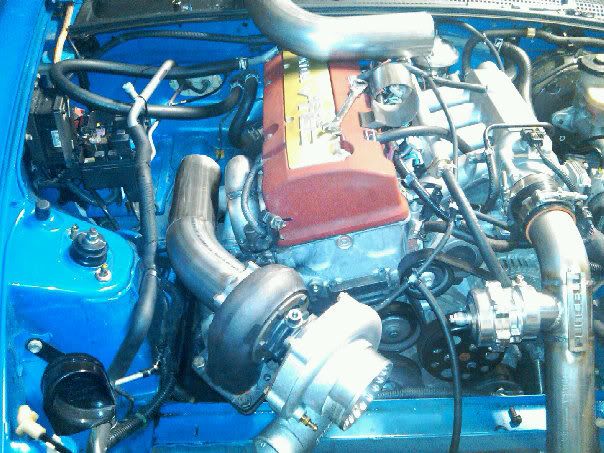 I finished the lower intercooler pipe, and got all my couplers in the mail, as well as my wastegate, So the car is running and driving again, without the sidepipe installed due to a clamp that still hasnt arrived in the mail. other than that, everything works properly, no leaks, of exhaust or oil. my hondata i should be getting in a week or so and ill be tuned. will post dyno sheets and info and pictures one side pipe is installed.