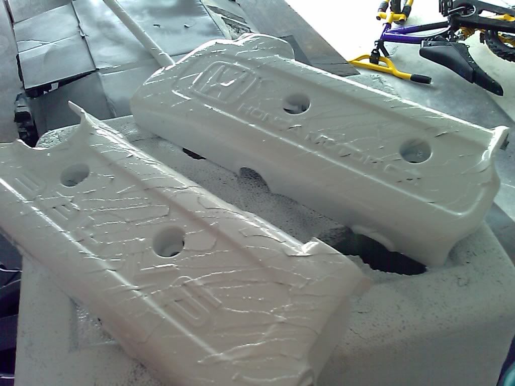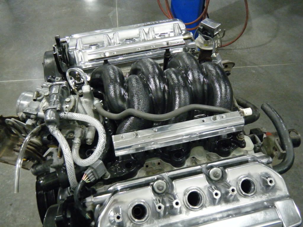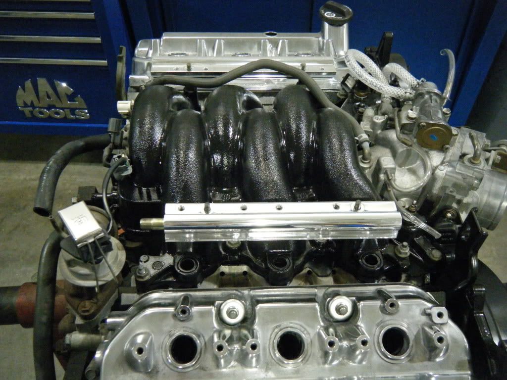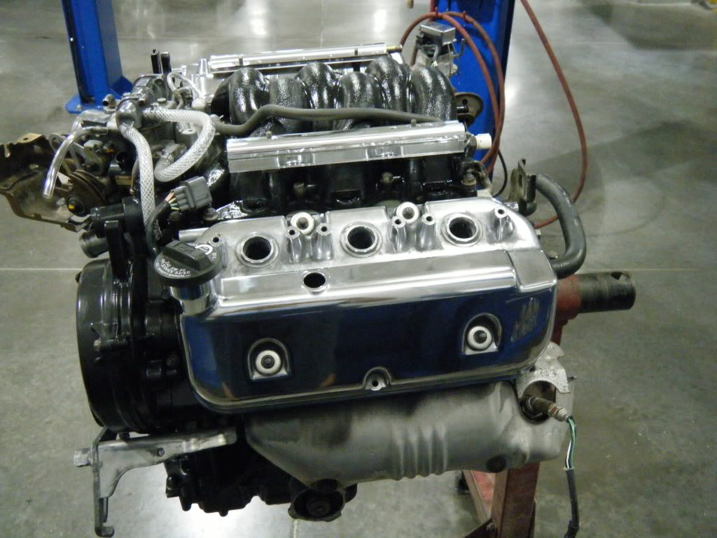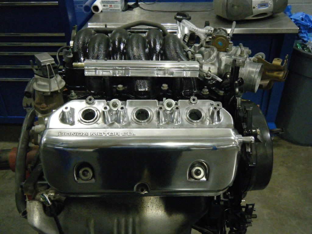 and before you slam me for the camo valve cover ....dont it was just something i was tring on a junk cover. it has a hole in it and is trash i was just testin out some paint. and yeah i know the polished one isnt done yet i just laid both them on so i wouldnt drop things in the heads but iam debating going with the polished look or paint them both wrinkle red...kinda like the type r valve covers....what cha think? but being bored at work with no work just decided to use some air craft remover and then try and see how they would polish out. then did the fuel rails to check those out. iam going to finsh the rails out and then have them clear coated cause i like those but unsure about leaving the valve covers.....