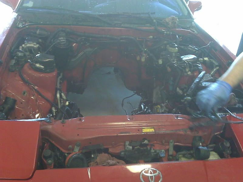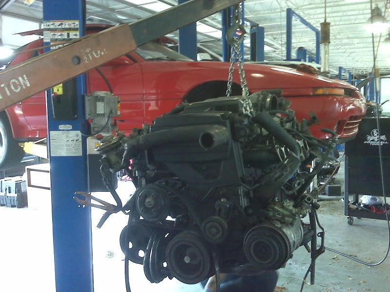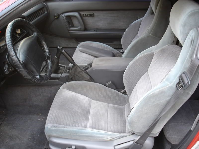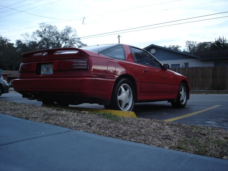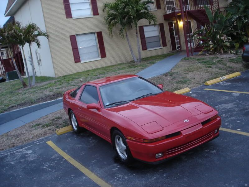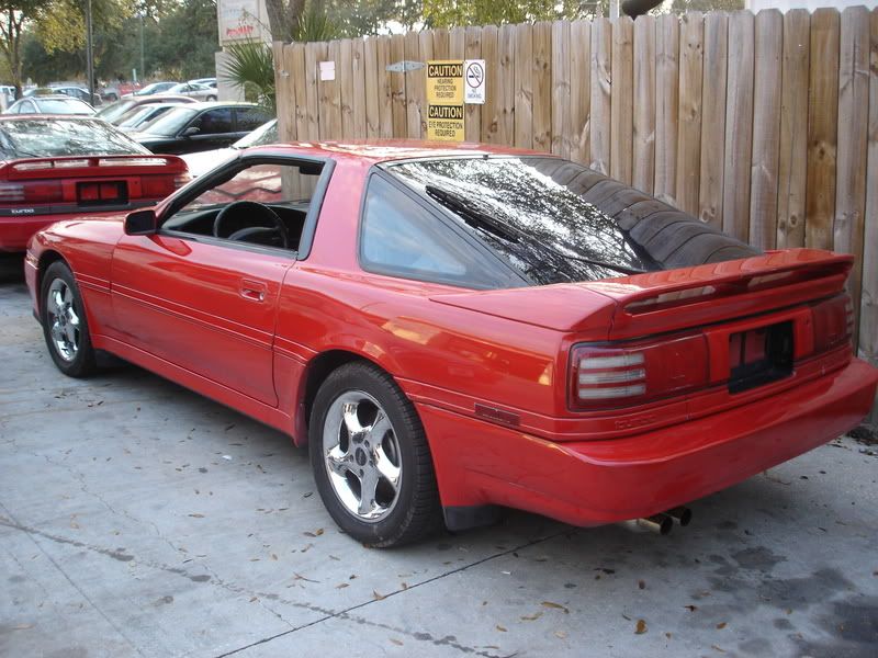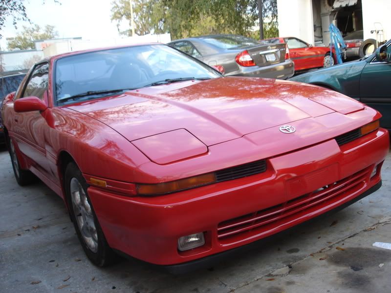 Anywho, on to the car. I just picked up a 1991 Toyota Supra Turbo Targa 5speed. It's Super Red II with shadow grey cloth interior. I purchased the car from a gentleman who just didn't have the time or motivation to fix her. It spun a bearing or two and overheats. I have a spare turbo engine that I'm going to be replacing the original engine with for the time being. I will have the engine on a stand at the shop while I get all the parts I need for my build.
